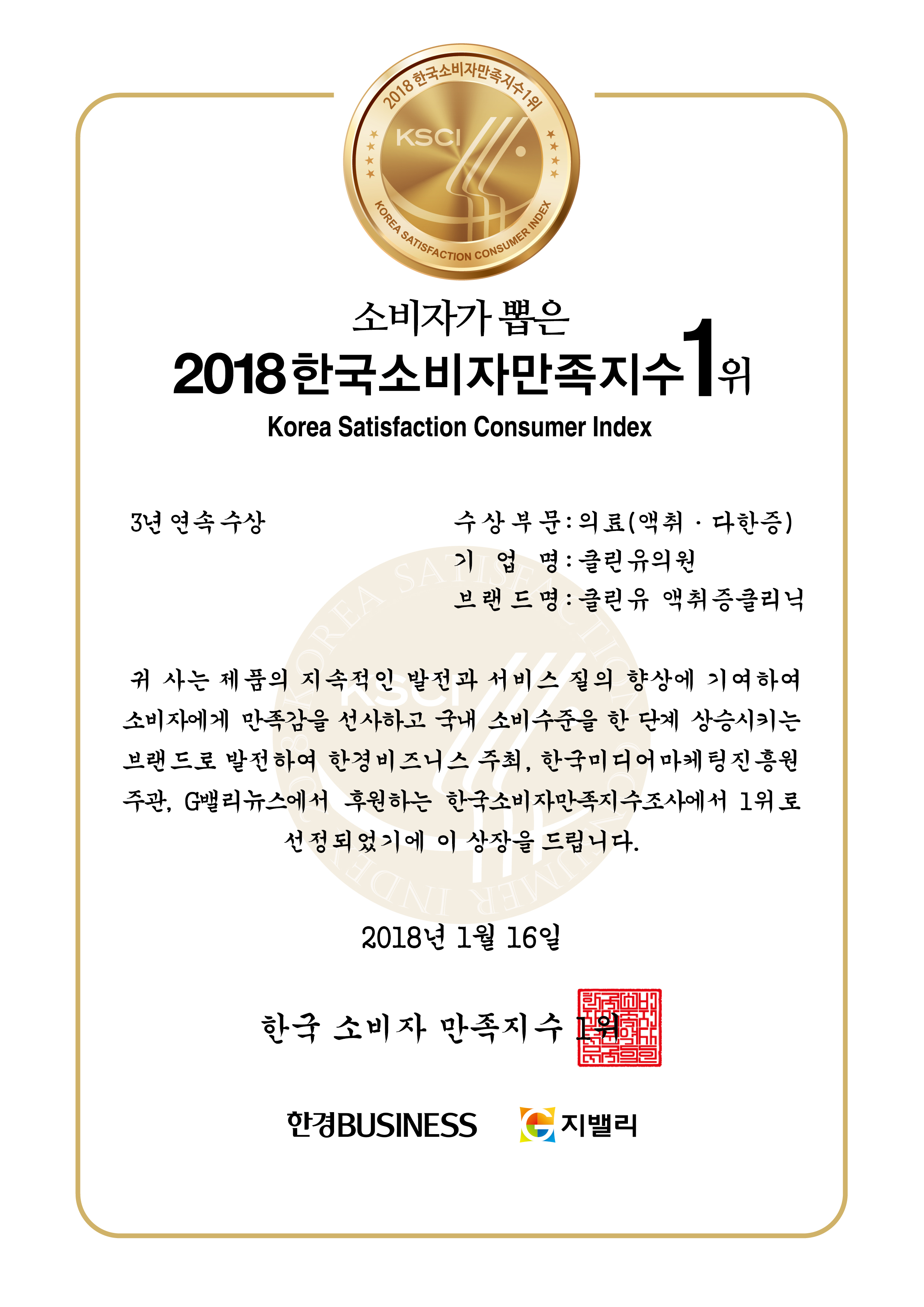 클린유의원이 2018 소비자만족지수 1위를 수상했습니다.