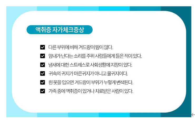 위 증상들 중 본인에게 해당되는 부분이 있다면 액취증을 의심해볼 수 있습니다.